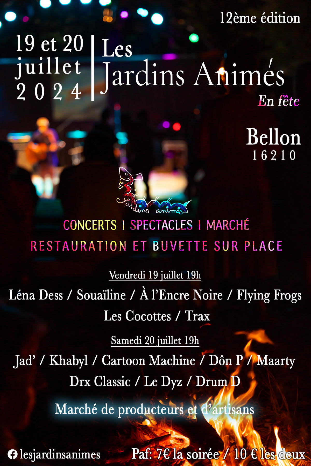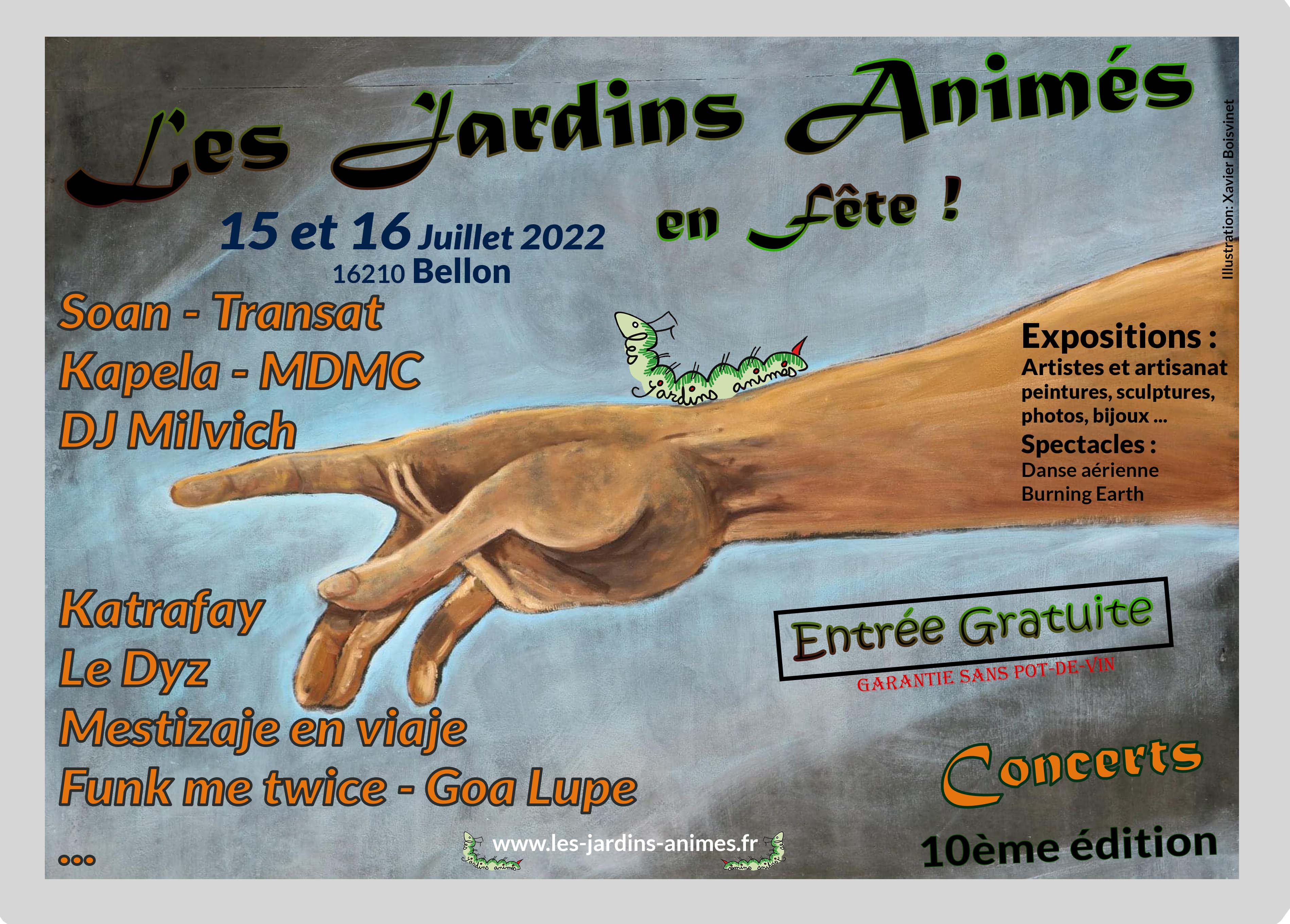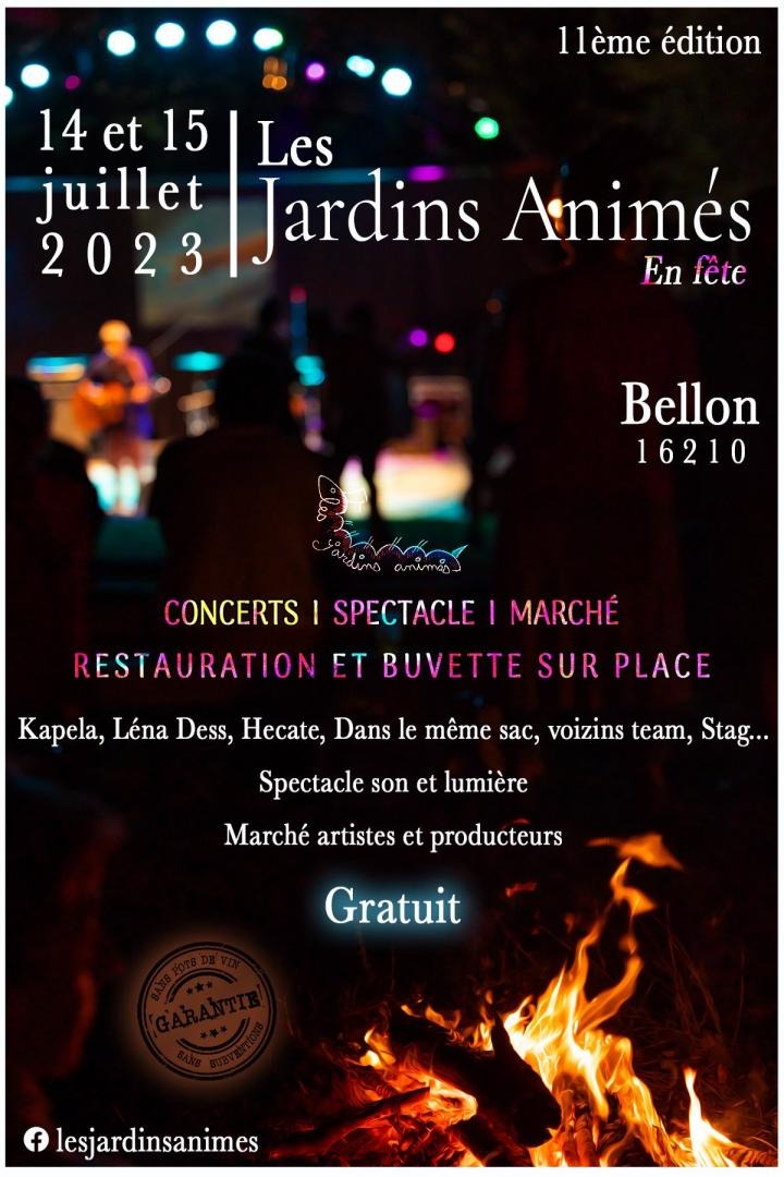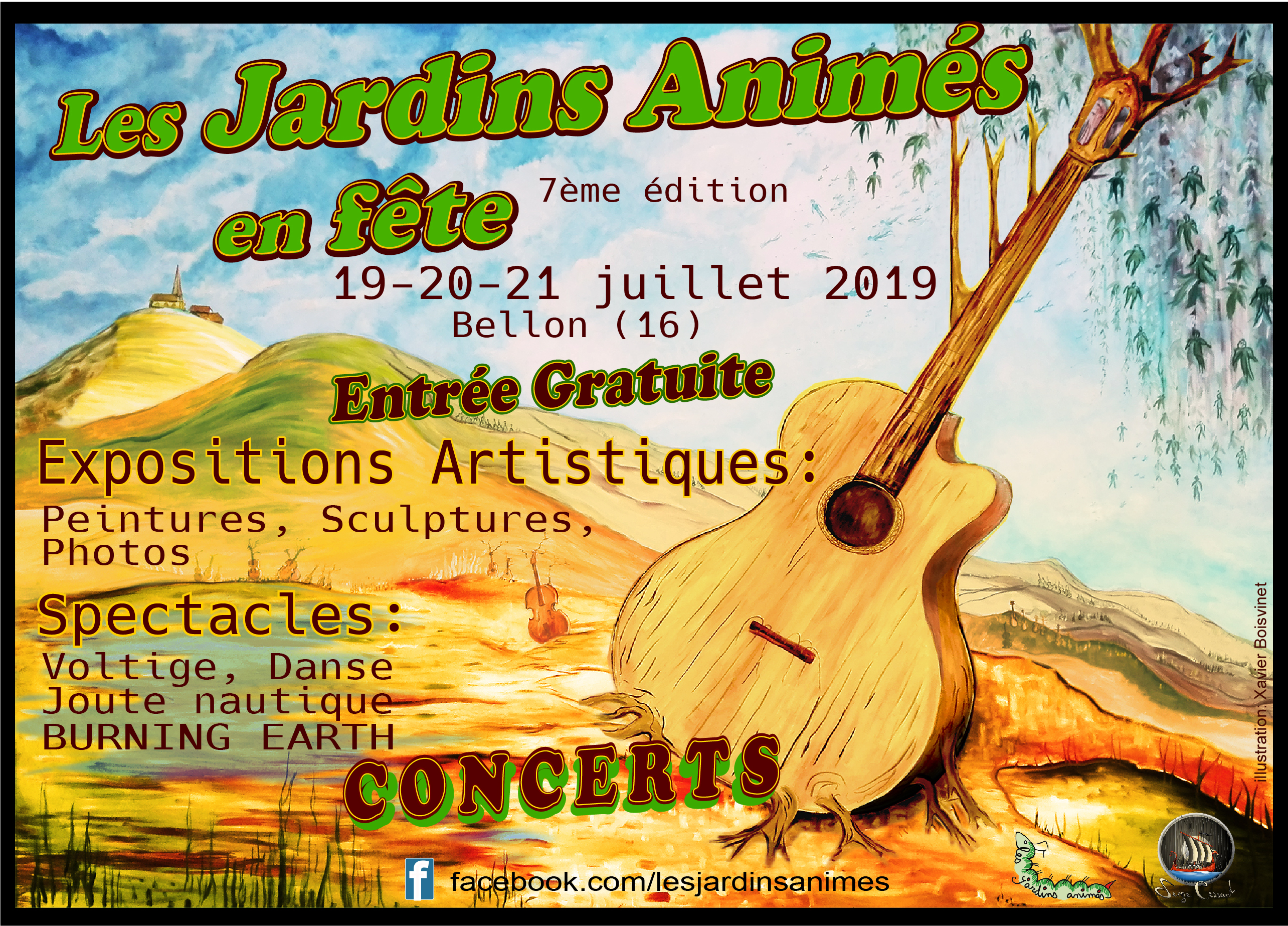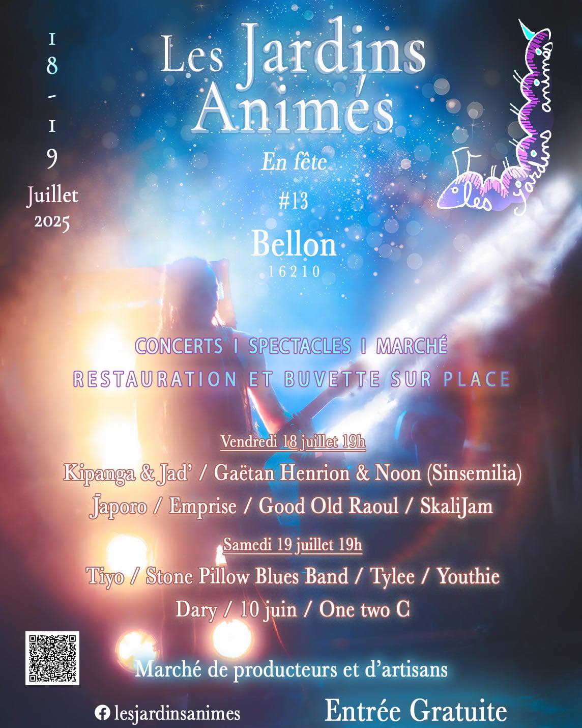 Depuis 2012, le Festival "Les Jardins Animés en Fête" a attiré des centaines d'artistes : musiciens, circassiens, peintres, sculpteurs et bien d'autres talents. Chaque année, ce festival transforme un petit coin de Sud Charente en un carrefour culturel vibrant où la créativité n'a pas de limites. La prochaine édition : 17 et 18 juillet 2026 à Bellon (16). Venez créer avec nous !