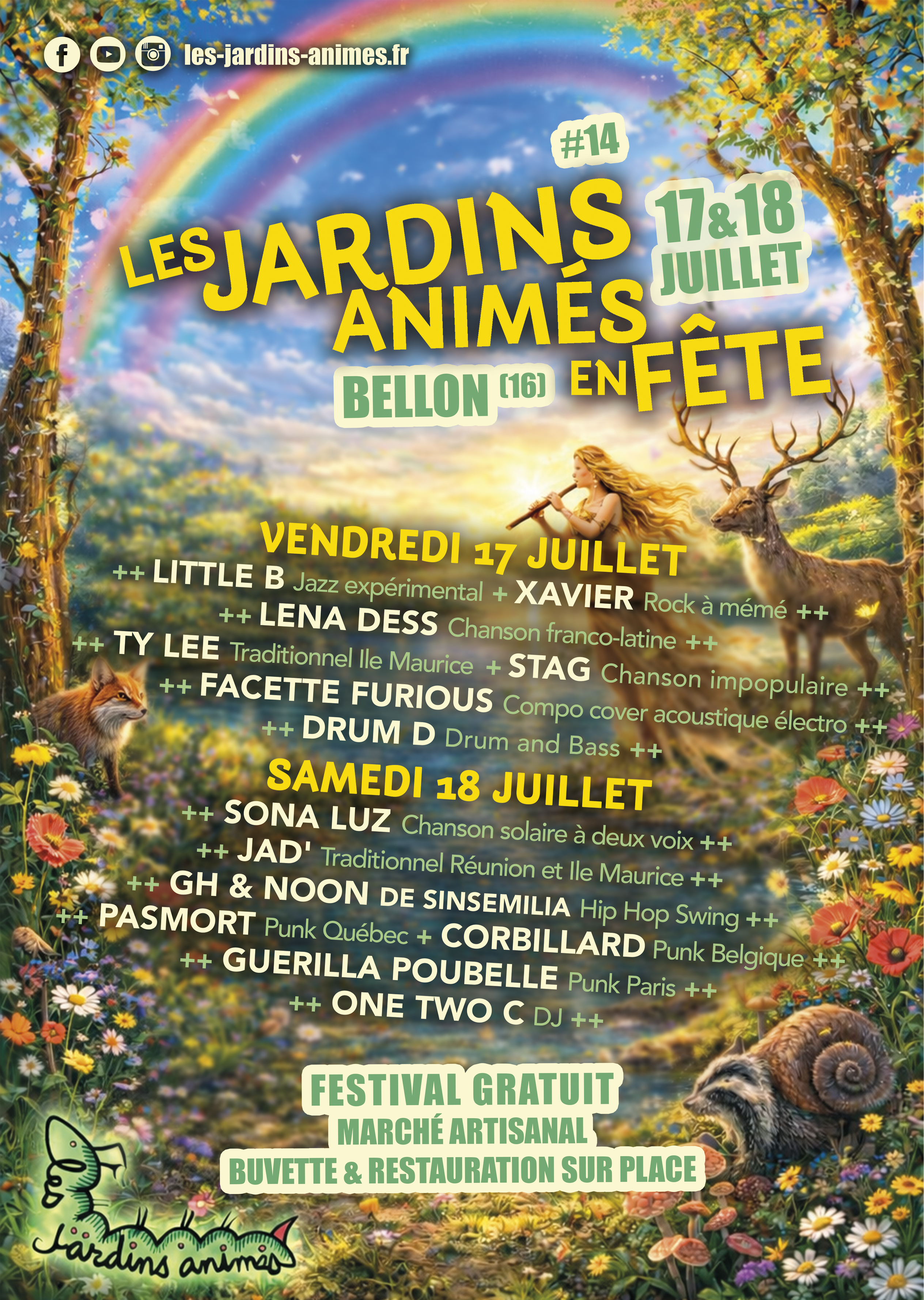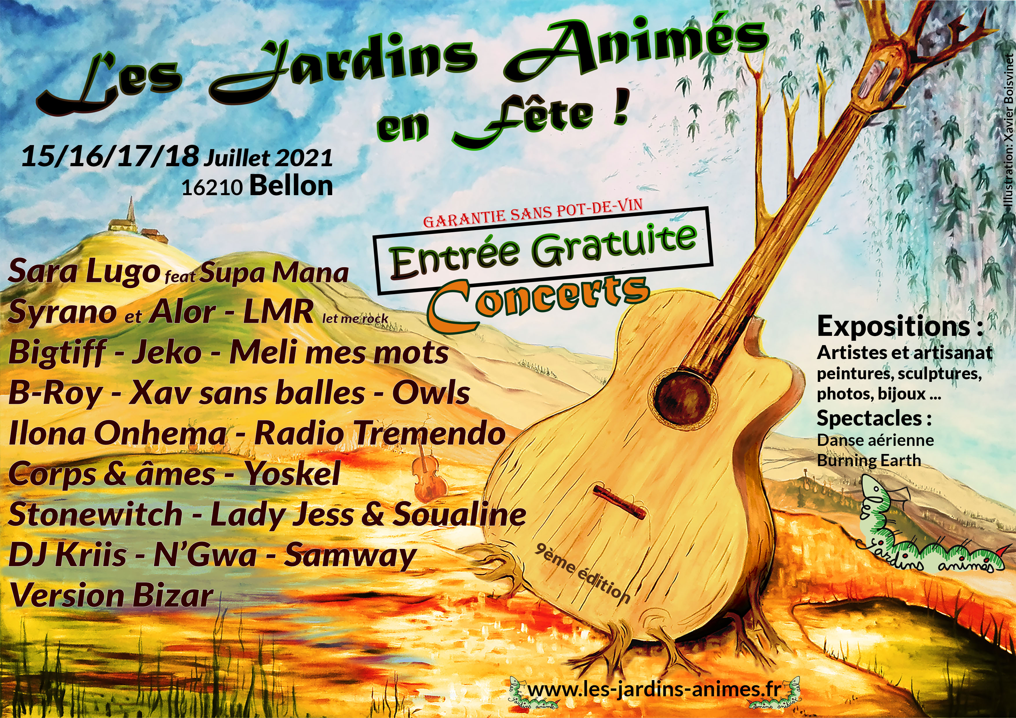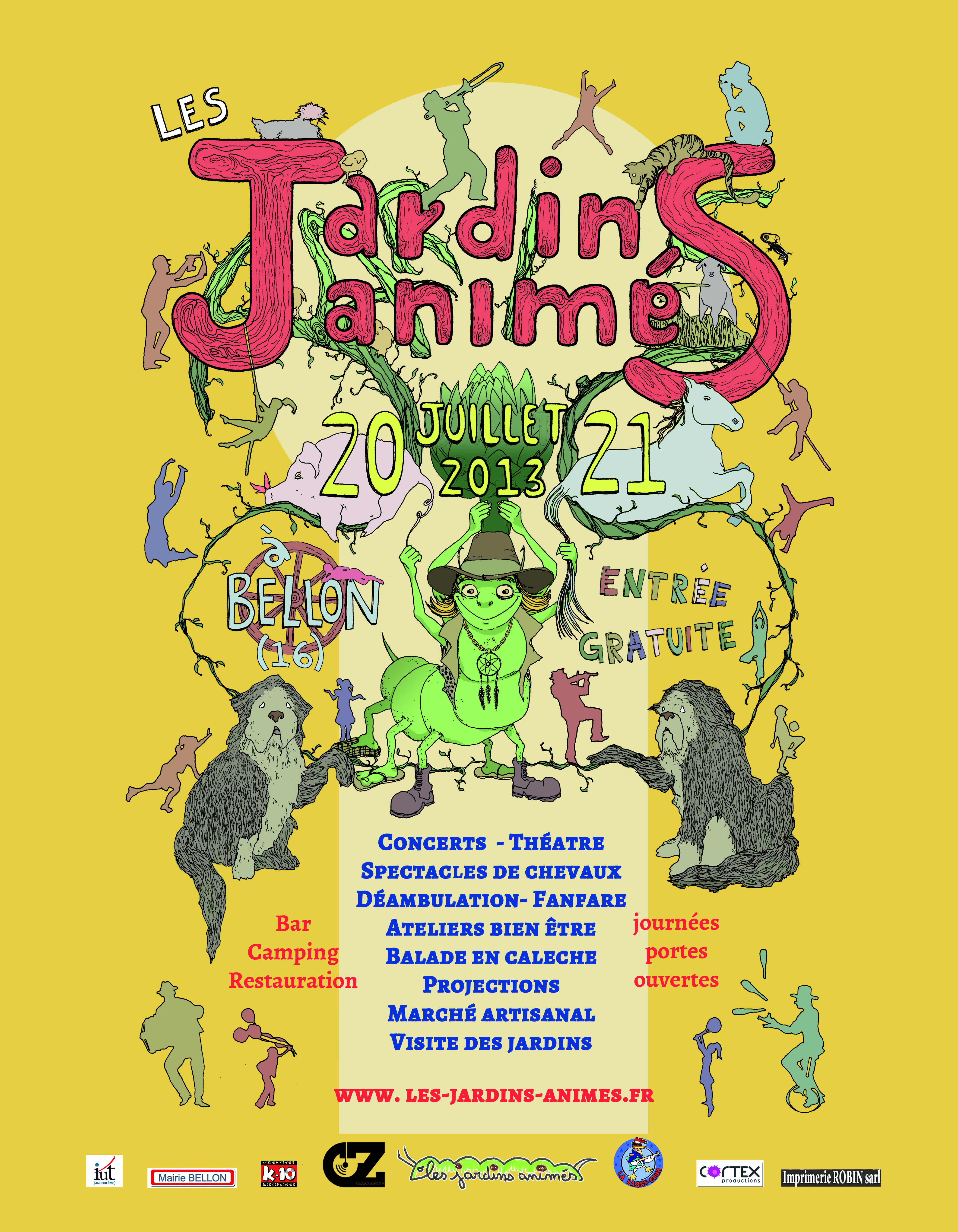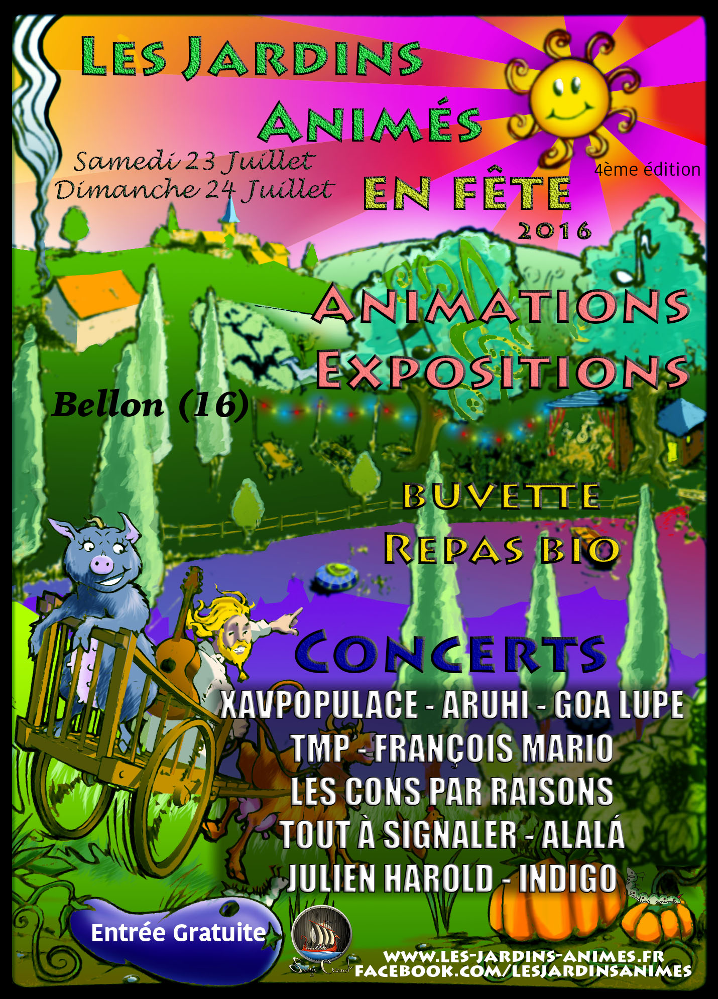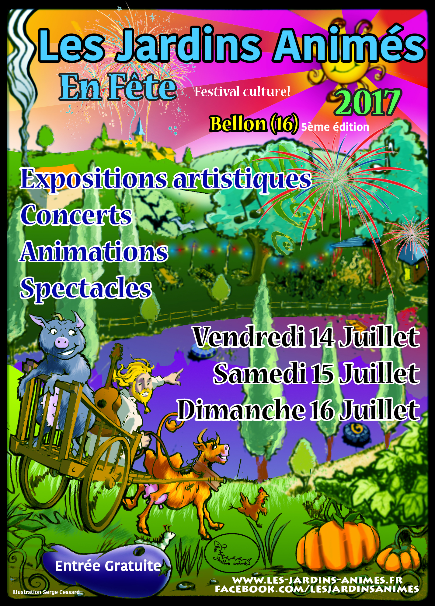 Depuis 2012, le Festival "Les Jardins Animés en Fête" a attiré des centaines d'artistes : musiciens, circassiens, peintres, sculpteurs et bien d'autres talents. Chaque année, ce festival transforme un petit coin de Sud Charente en un carrefour culturel vibrant où la créativité n'a pas de limites. La prochaine édition : 17 et 18 juillet 2026 à Bellon (16). Venez créer avec nous !
